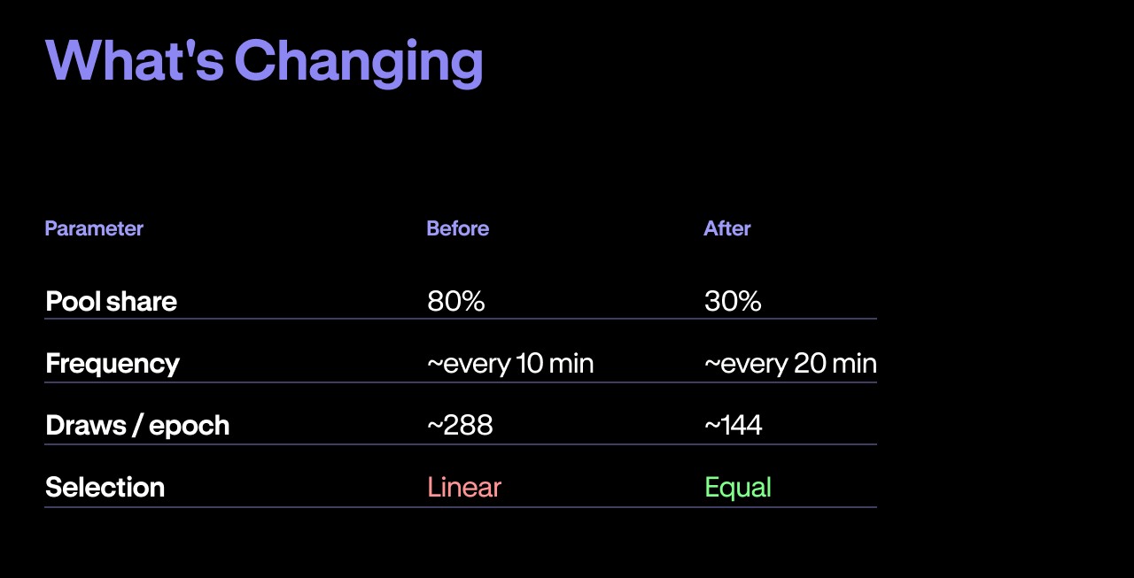 This is the headline addition. A completely new draw that runs every epoch, picks 7 unique winners, and receives the largest share of the reward pool at 50%.Parameters: