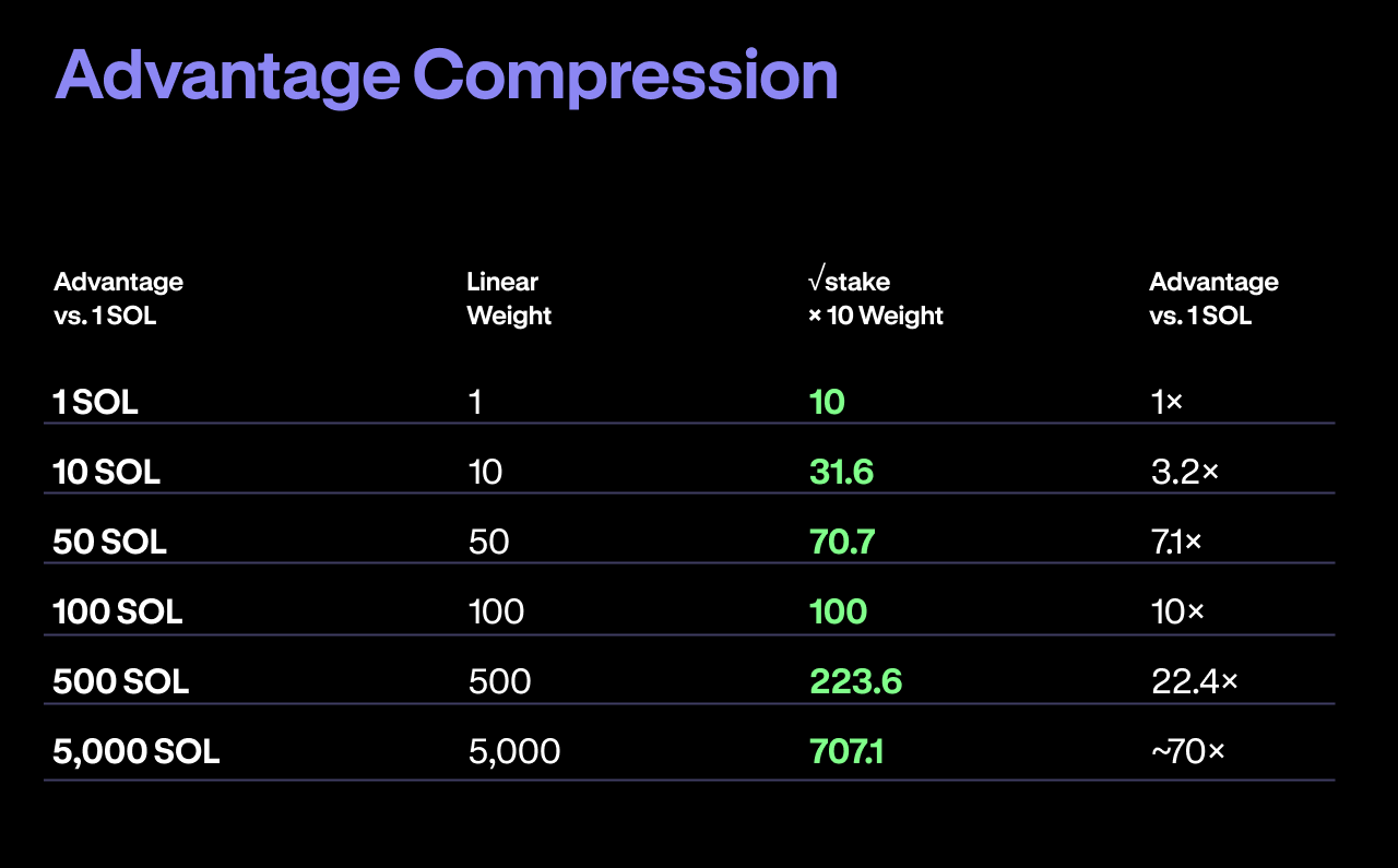Going from 1 to 4 SOL doubles your weight (√1 = 1, √4 = 2). But going from 100 to 400 SOL also only doubles your weight (√100 = 10, √400 = 20).