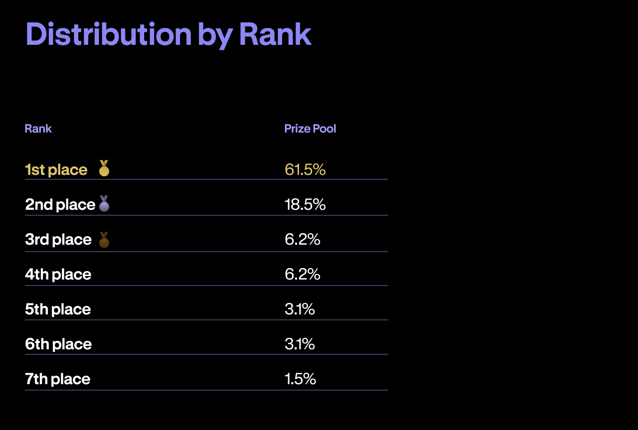The 7 winners don't split equally - it's a top-heavy distribution where 1st place takes the lion's share: