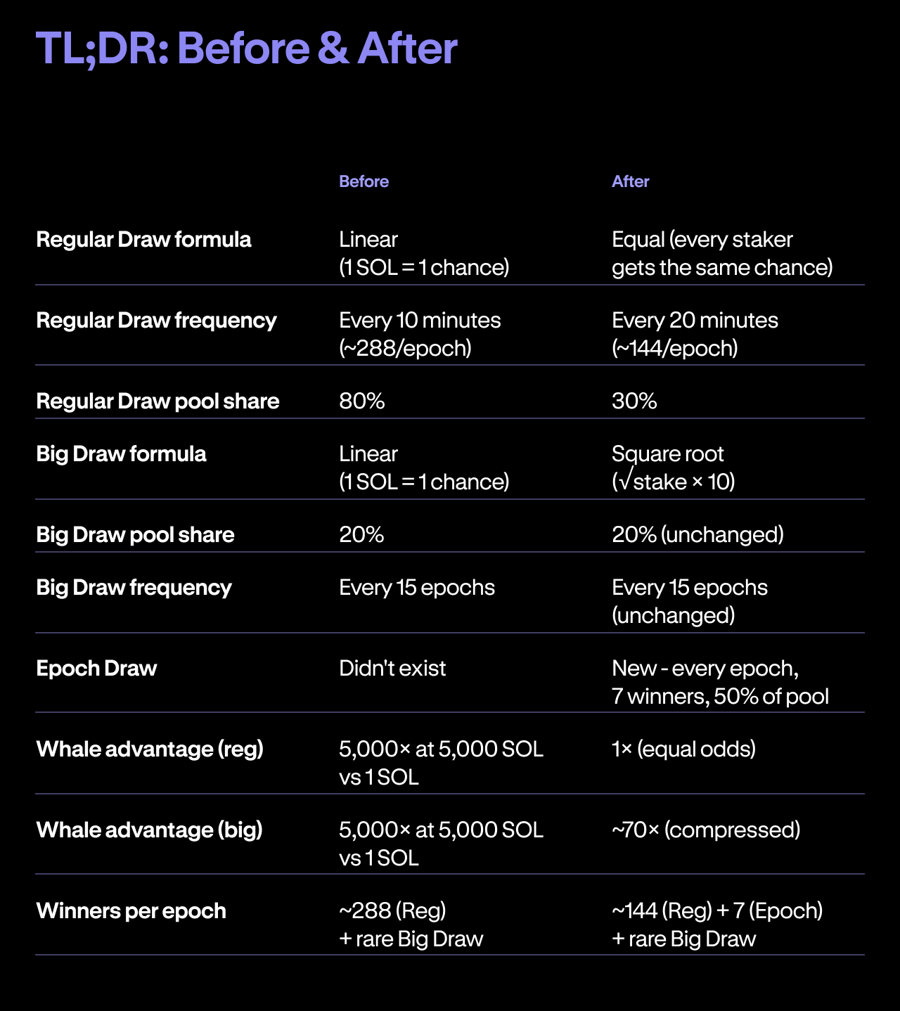 The core update: we're rebalancing the reward pool so that every staker - regardless of size - has a real chance of winning.