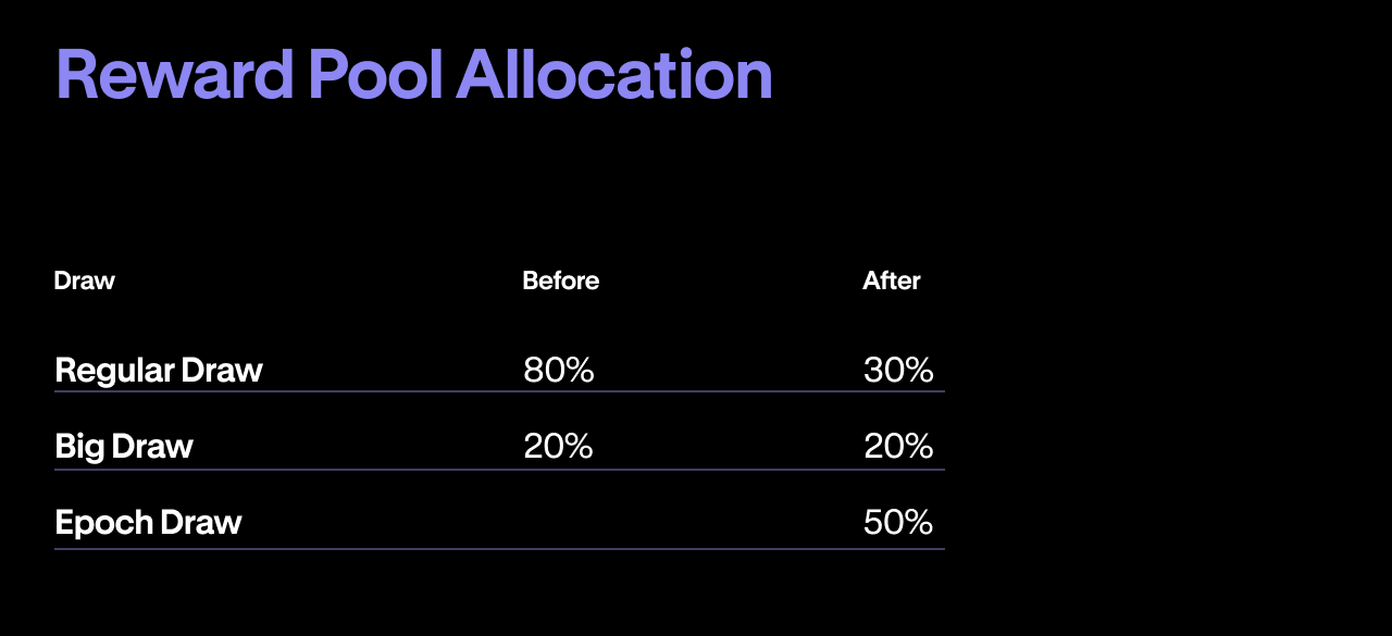- A brand-new Epoch Draw takes 50% of the pool and picks 7 winners every epoch using linear weighting based on effective stake.